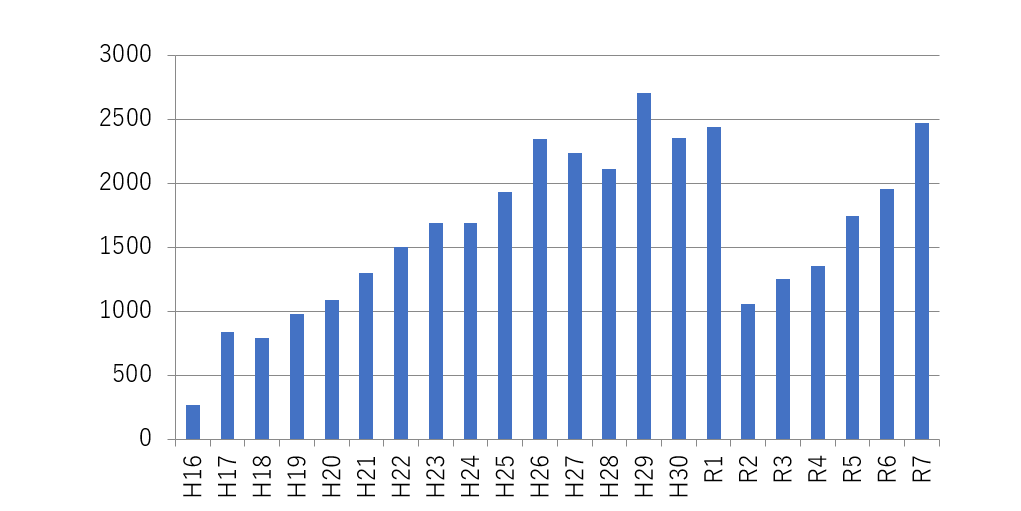 | 1.みどりキッズの年度別利用数の推移(H16-R7) |